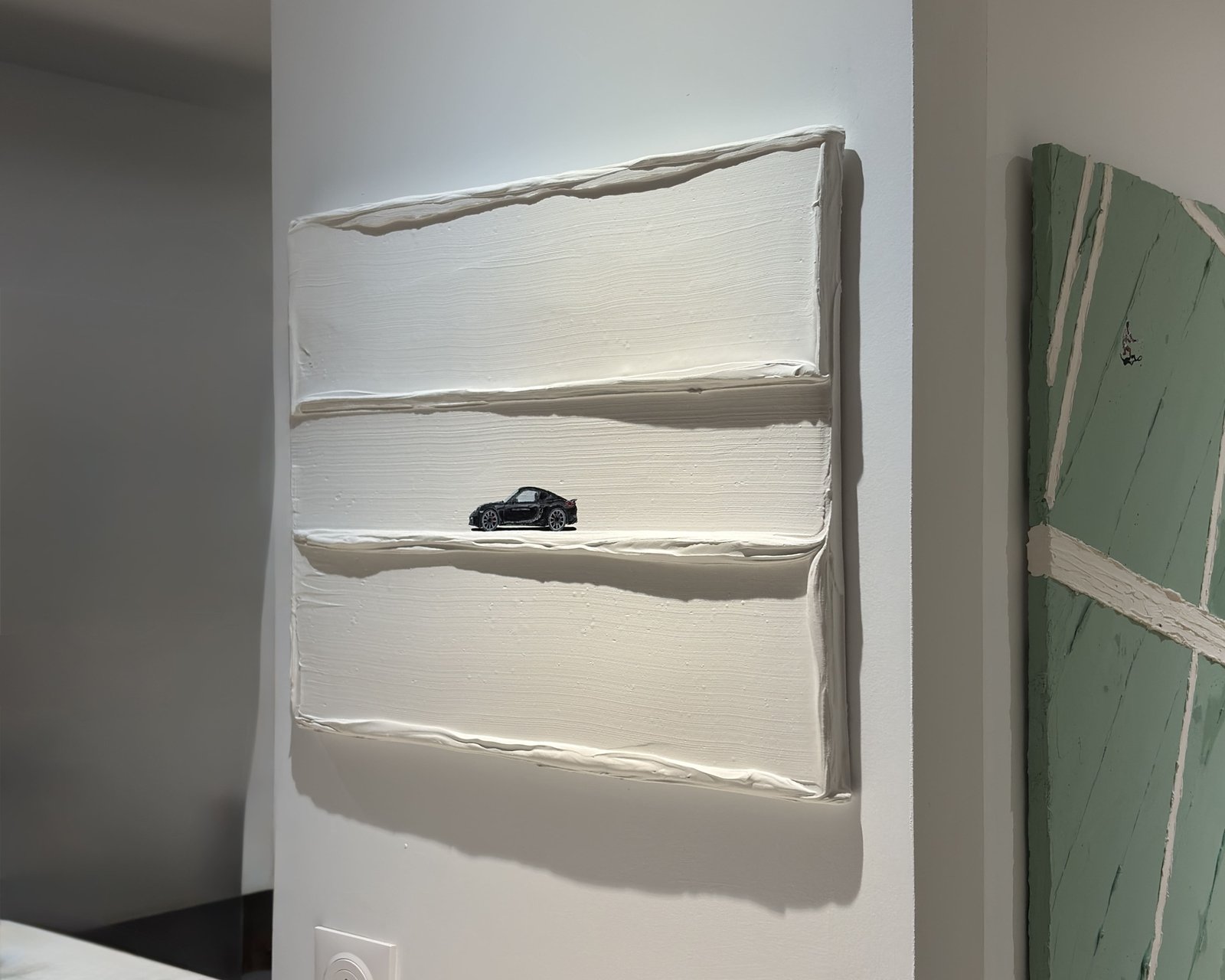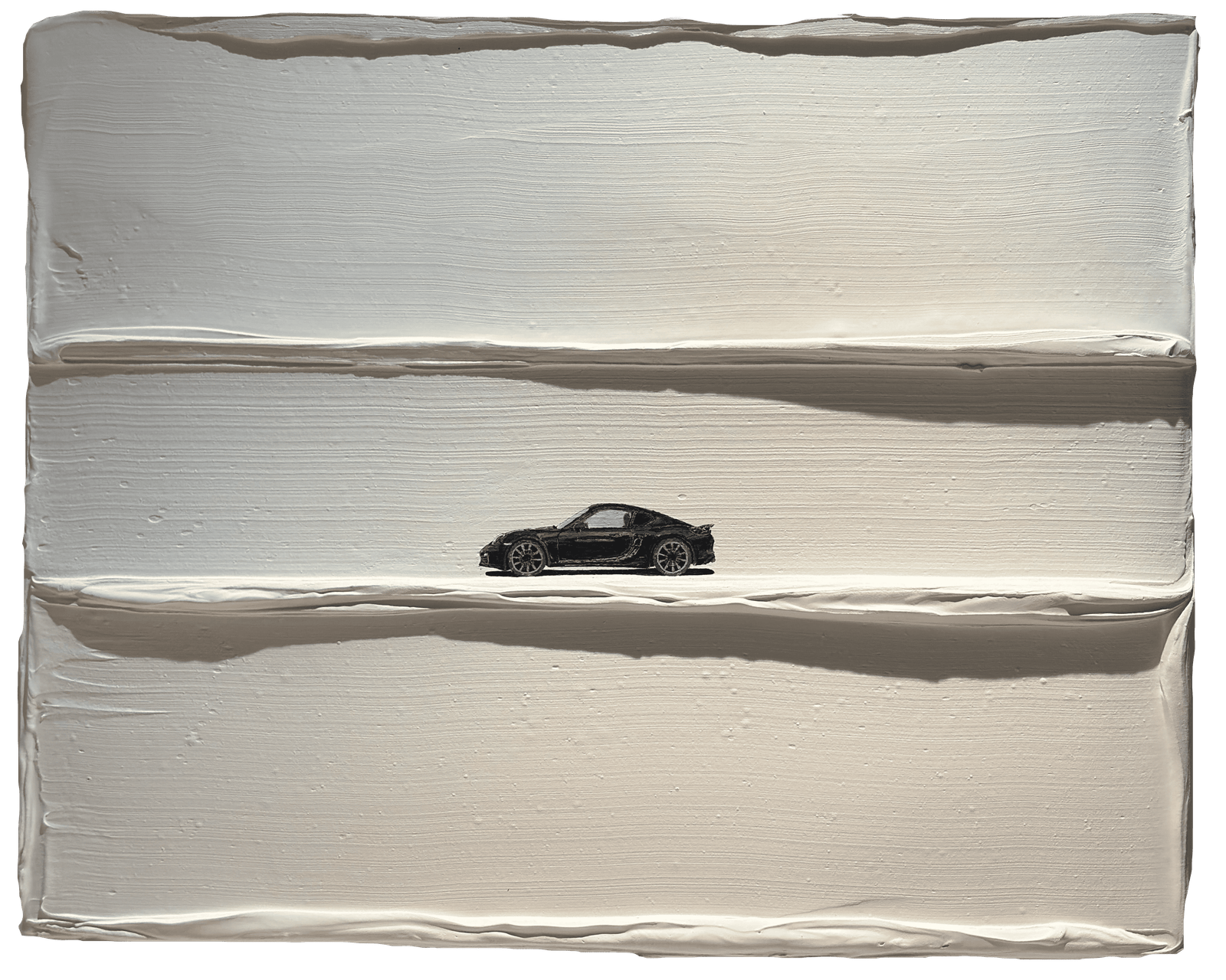 "Black & White" was created with a clear vision: to enhance the iconic Cayman S 981 through a rendering of absolute sobriety. Set against thick impasto ridges of pure white, the sleek and aggressive black silhouette of the car immediately captures the attention.