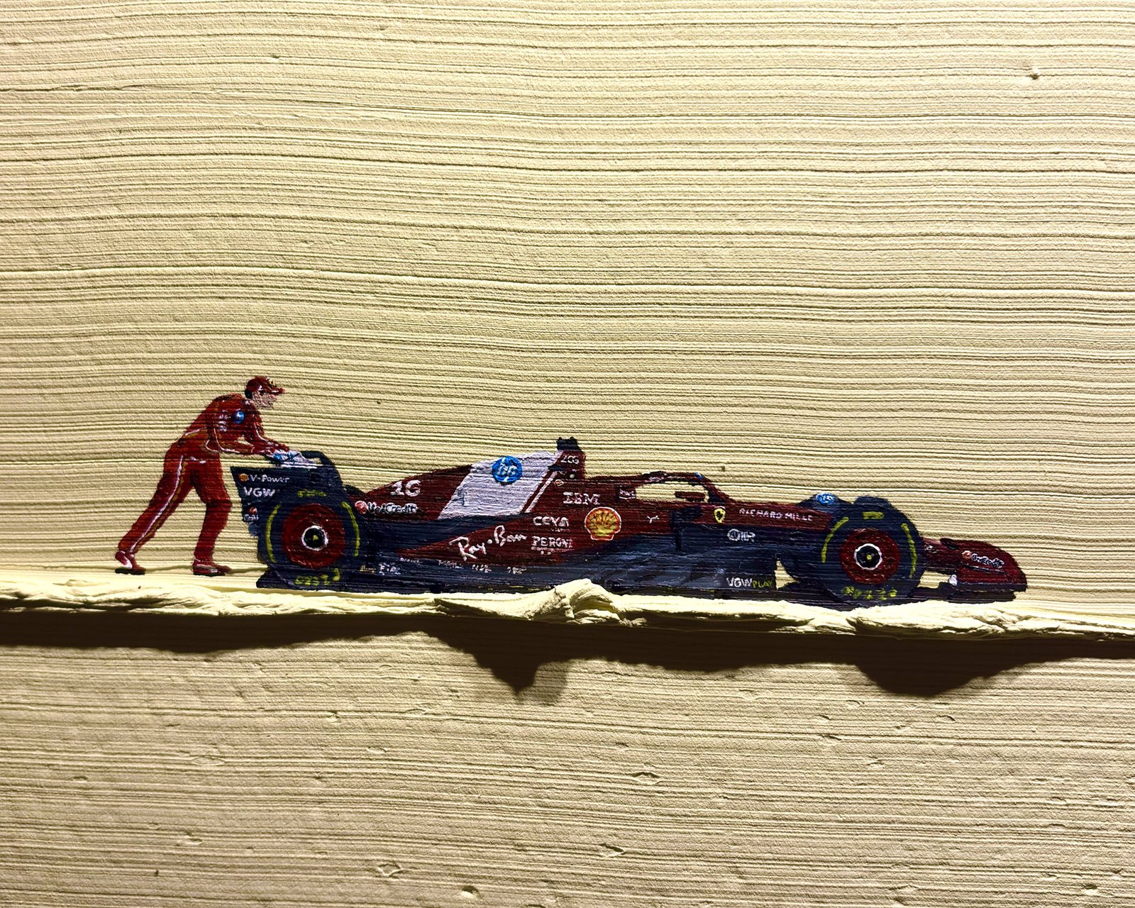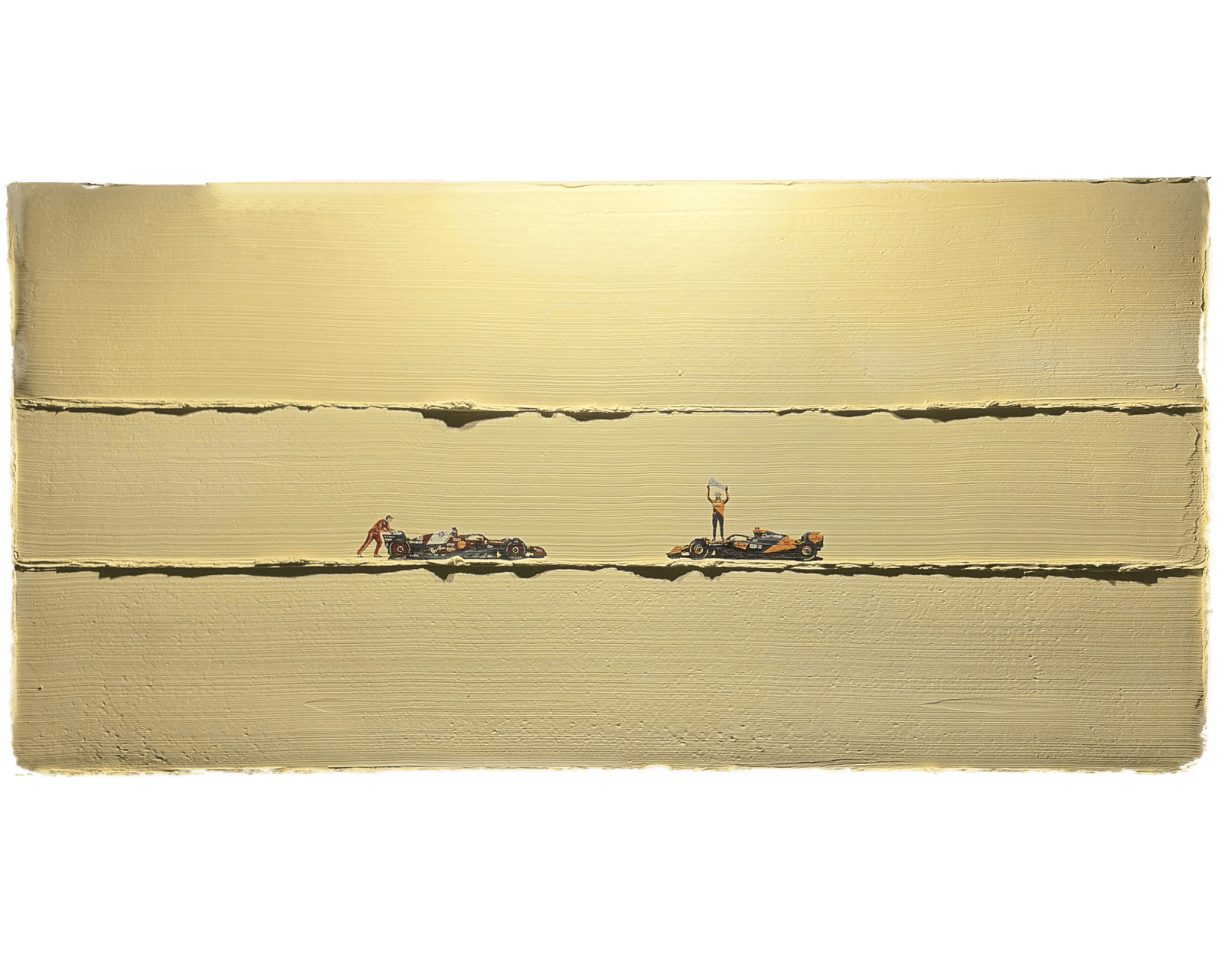 Set against a textured background with sun-kissed reflections, this work captures a pivotal moment in Formula 1.