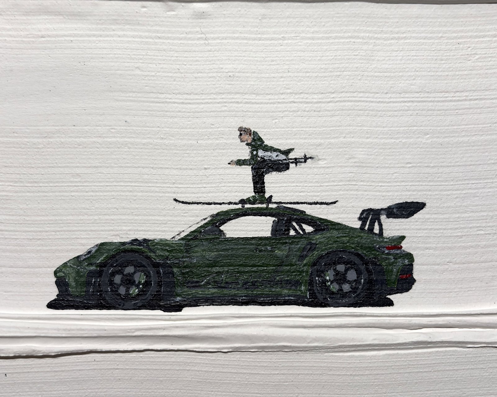 On thick layers of snow sculpted with a palette knife, a high-performance black sports car tears through the landscape, topped with a skier ready to give it their all.