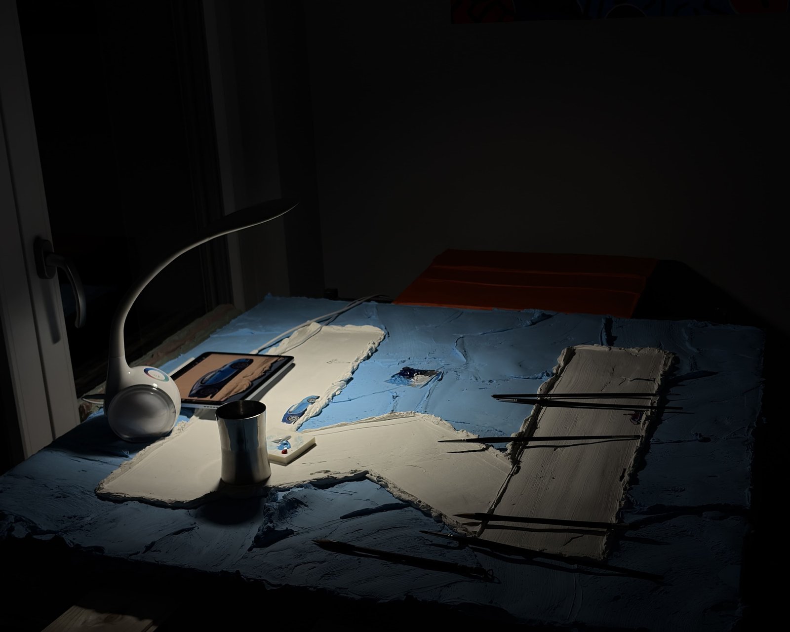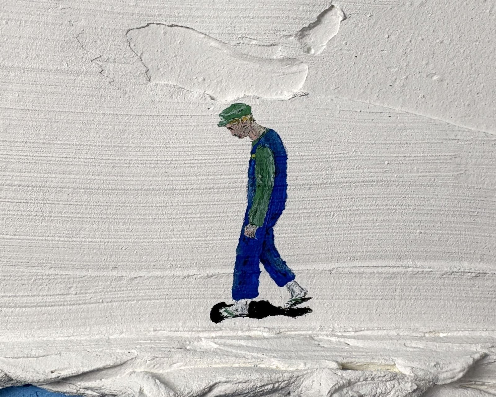 But ambition takes over. A solitary figure begins to climb the steps of raw material, facing the difficulty of the ascent.
