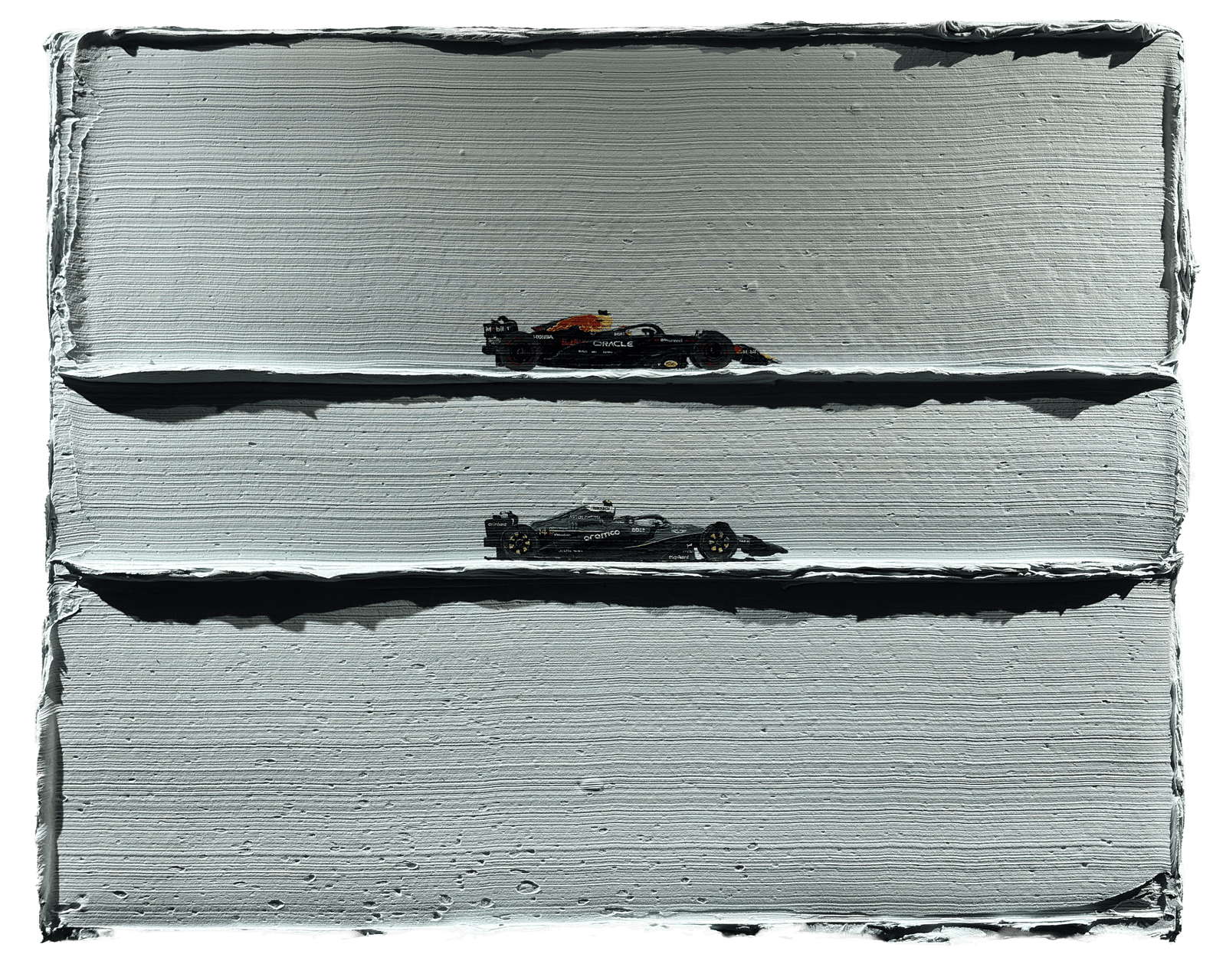The adrenaline of the circuits, frozen on canvas.